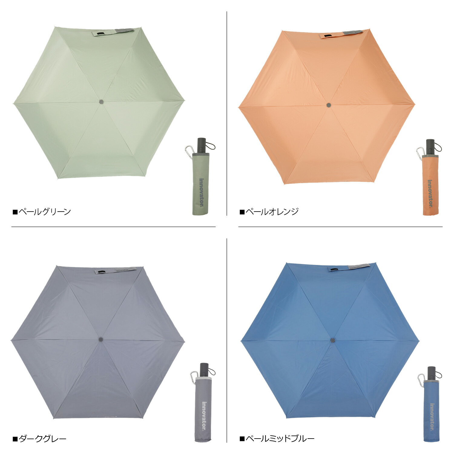 ブランド名 / 商品名 innovator イノベーター / IN-55WJP カラー ブラック:BLACK(18159) スチールグレー:STEEL GRAY(18158) ネイビー:NAVY(18157) ペールブルー:PALE BLUE(18154) ペールグリーン:PALE GREEN(18156) ペールオレンジ:PALE ORANGE(18155) 素材 / 仕様 ポリエステル 100% 重量:280g(収納袋除く) 生産国 - サイズ 親骨の長さ:55cm 全長(収納時):約28cm 直径:約97cm×持ち手の長さ:5.5cm×持ち手の太さ:3cm こちらの商品は、メーカー公式の採寸基準で計測しています。